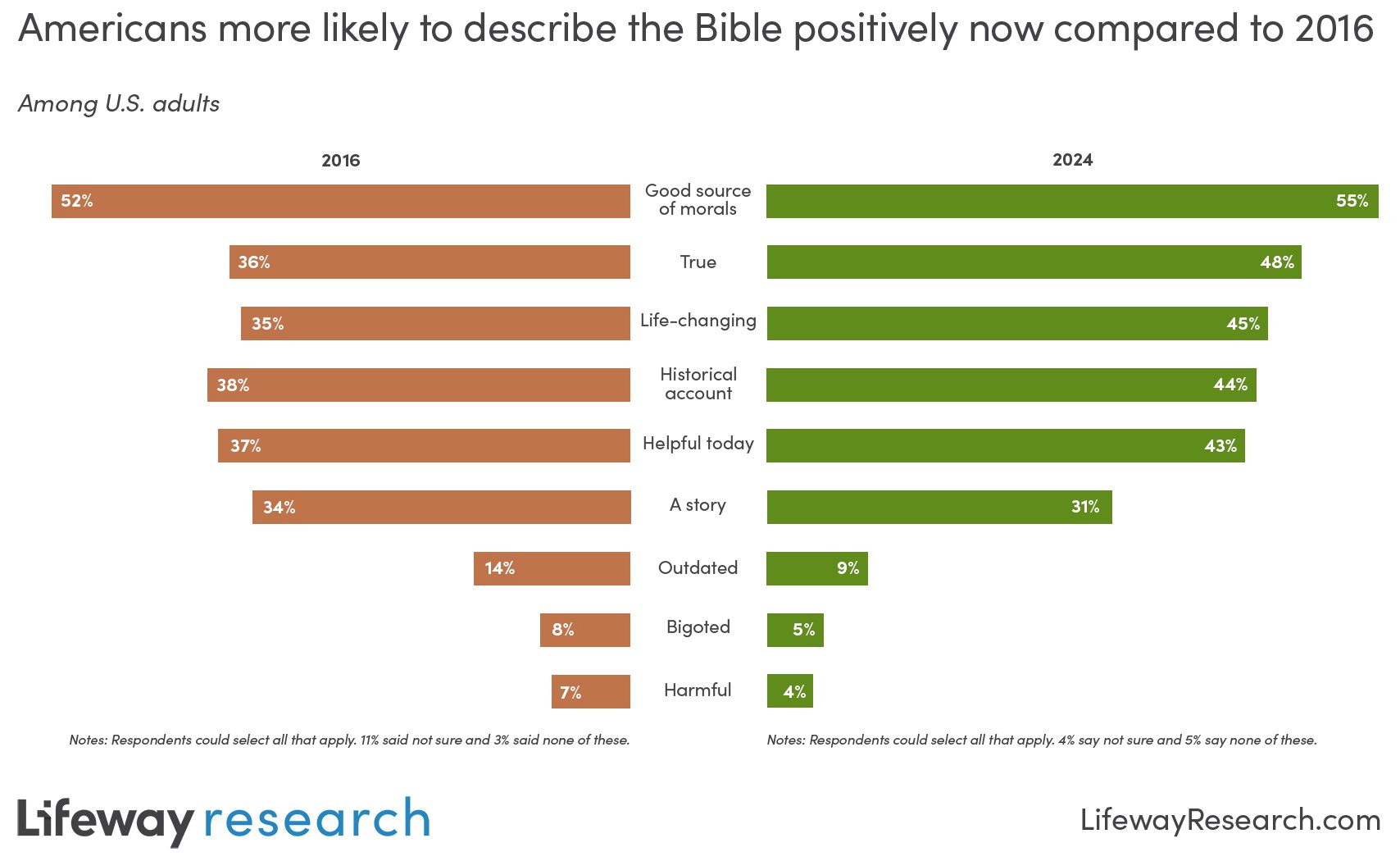 Additionally, U.S. adults today are more likely than in 2016 to say Scripture is true (48% v. 36%), life-changing (45% v. 35%), a historical account (44% v. 38%) and helpful today (43% v. 37%). Americans are also less likely to describe the Bible as outdated (9% v. 14%), bigoted (5% v. 8%) or harmful (4% v. 7%).