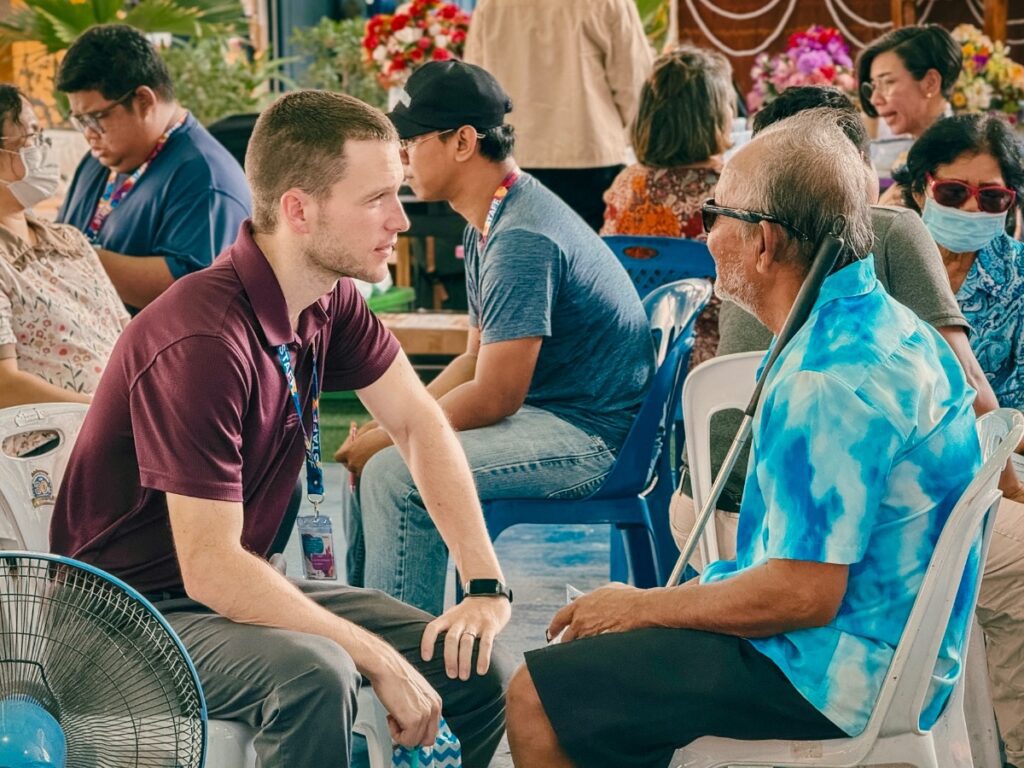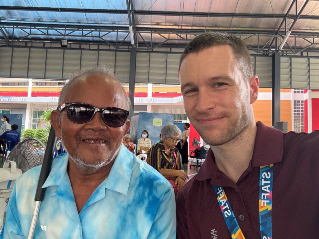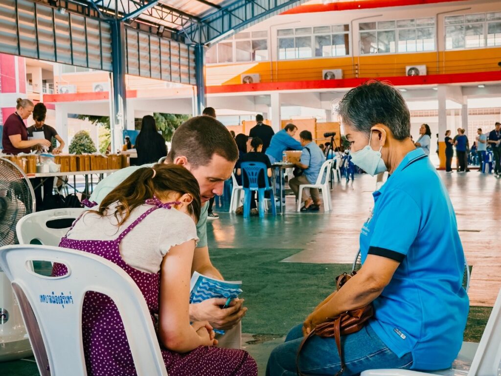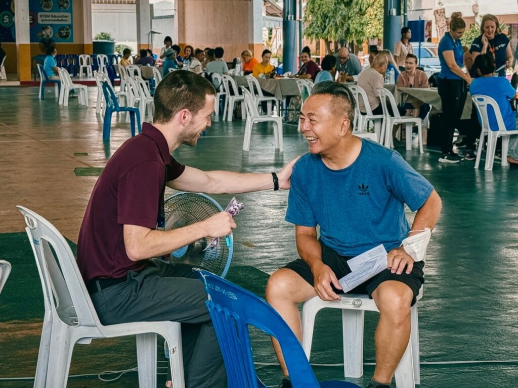 A blind man came to the clinic for some sunglasses. He couldn’t afford to buy more, and the ones he was using were glued together. The medical team hooked him up with three new pairs! He was thankful and didn’t mind sitting around and chatting more while he waited for his wife to get her eyes checked. This gave me extra time to talk with him. Mr. Hian started to show interest in the gospel. Even though I couldn’t look into his eyes, I could tell he had a special interest in who Jesus is and what he came to do. There was a moment in our conversation when he expressed that he wanted to trust in Christ. I called my Thai brother, Wat, to come over and help me continue to talk with him.