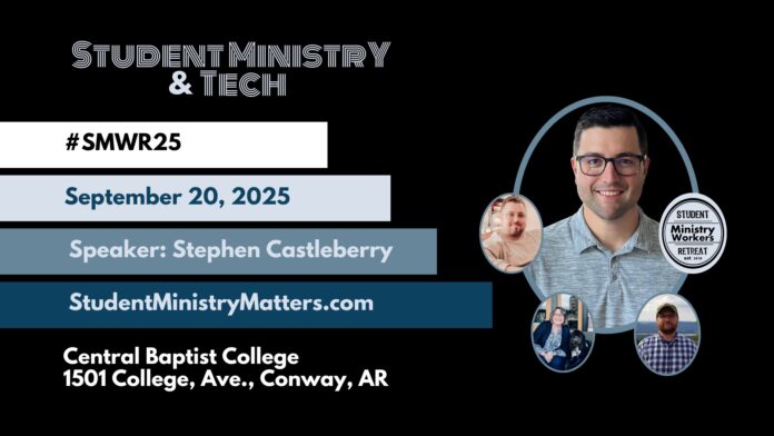 On Sept. 20, 2025, we will be meeting at Central Baptist College for the 8th Annual Student Ministry Workers Retreat (SMWR). It is all about learning more about student ministry and connecting with others with a similar passion. There will be goody bags, snacks, giveaways, worship, breakout groups and more. Your registration includes lunch and a full day of training.